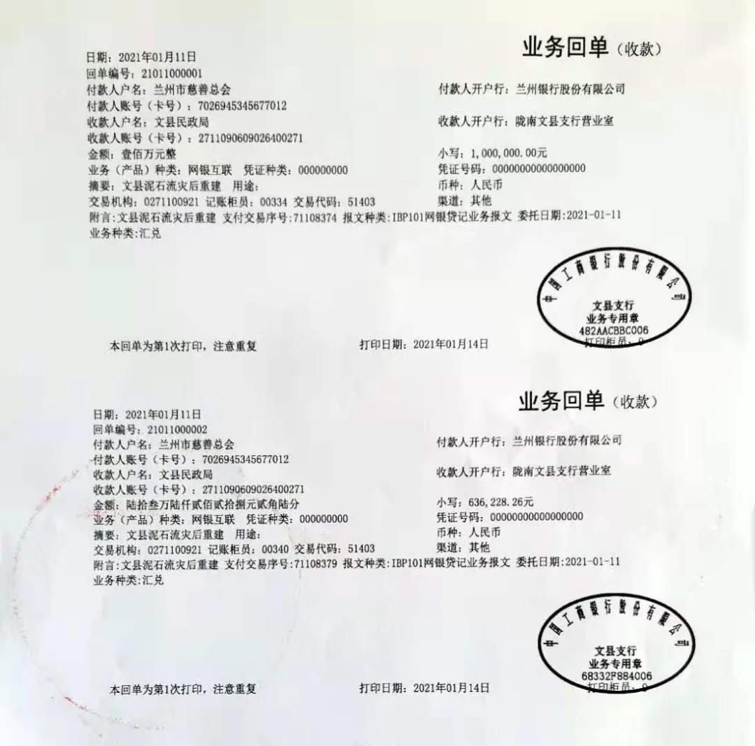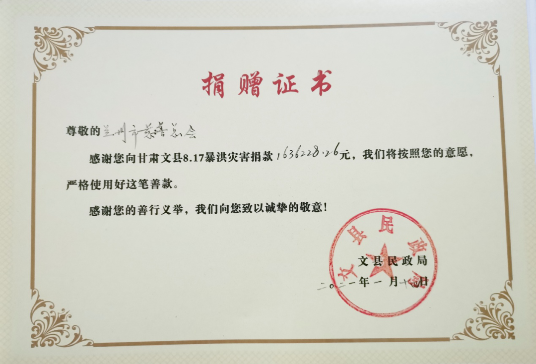 兰州市慈善总会向文县“8.12”暴洪灾害捐款1636228.26元