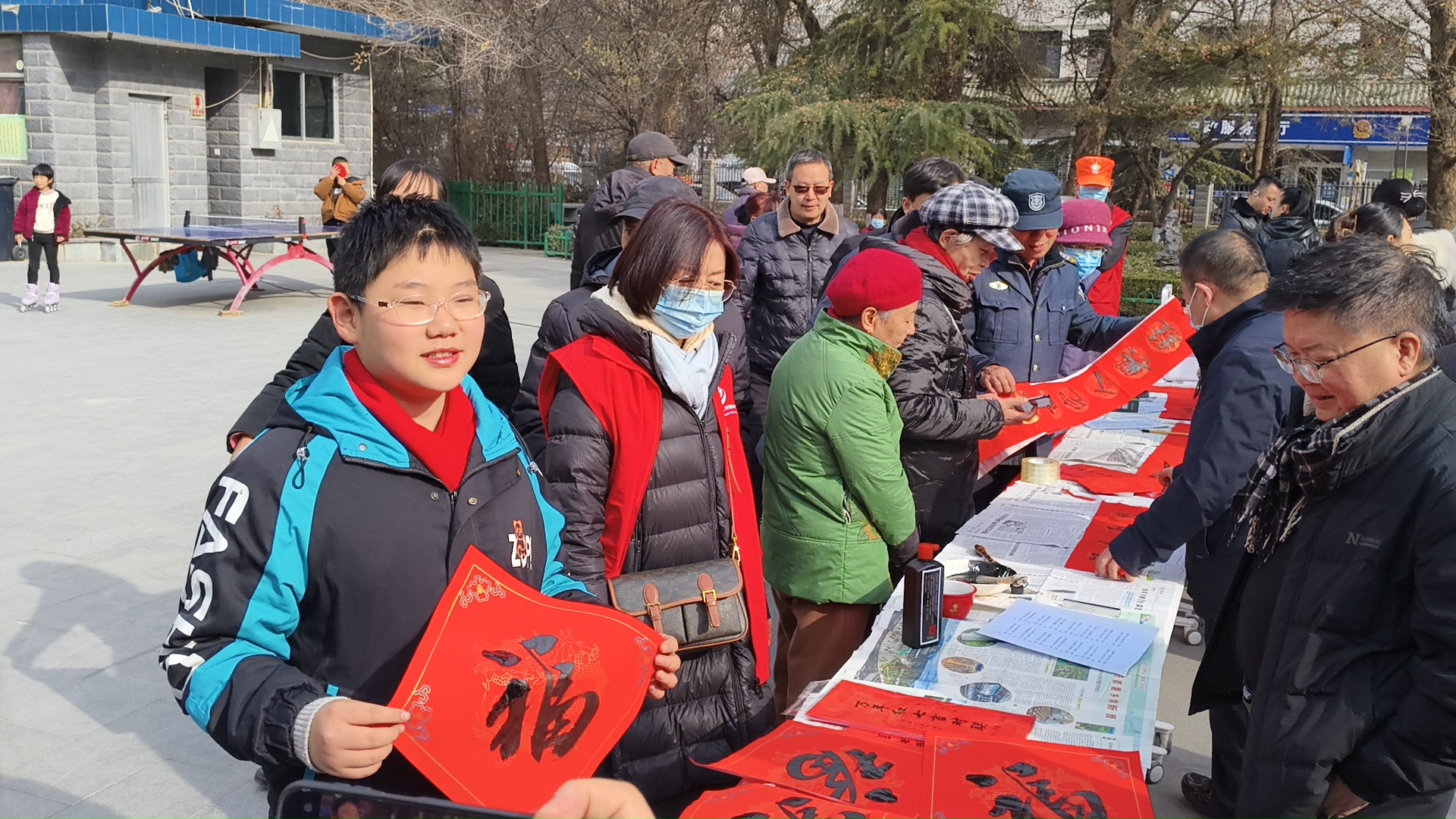 营门滩社区,工作人员将提前写好的春联悬挂在现场,供居民认领。现场多位书法家还展纸提笔,义务书写。尽管时值寒冬,现场却暖意涌动。一幅幅春联墨迹未干,承载的不仅是新春祝福,更是社会各界助力慈善、奉献爱心的共同心愿。